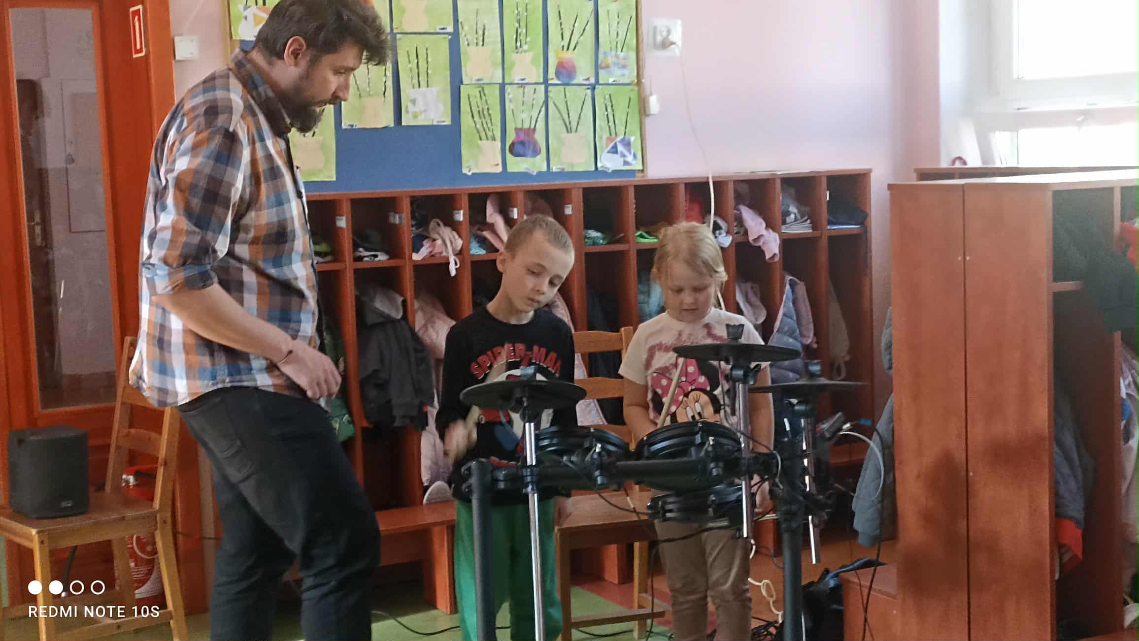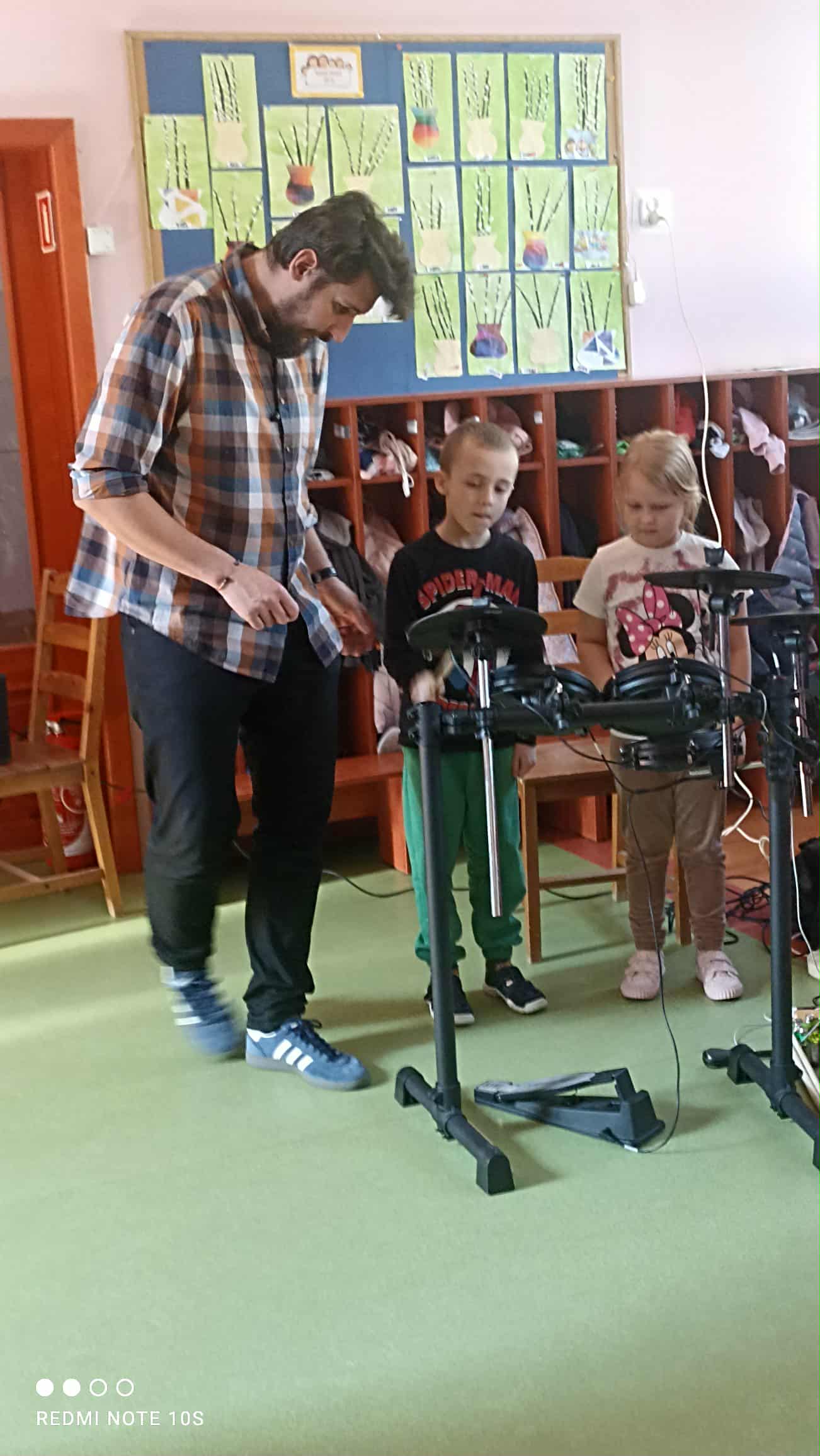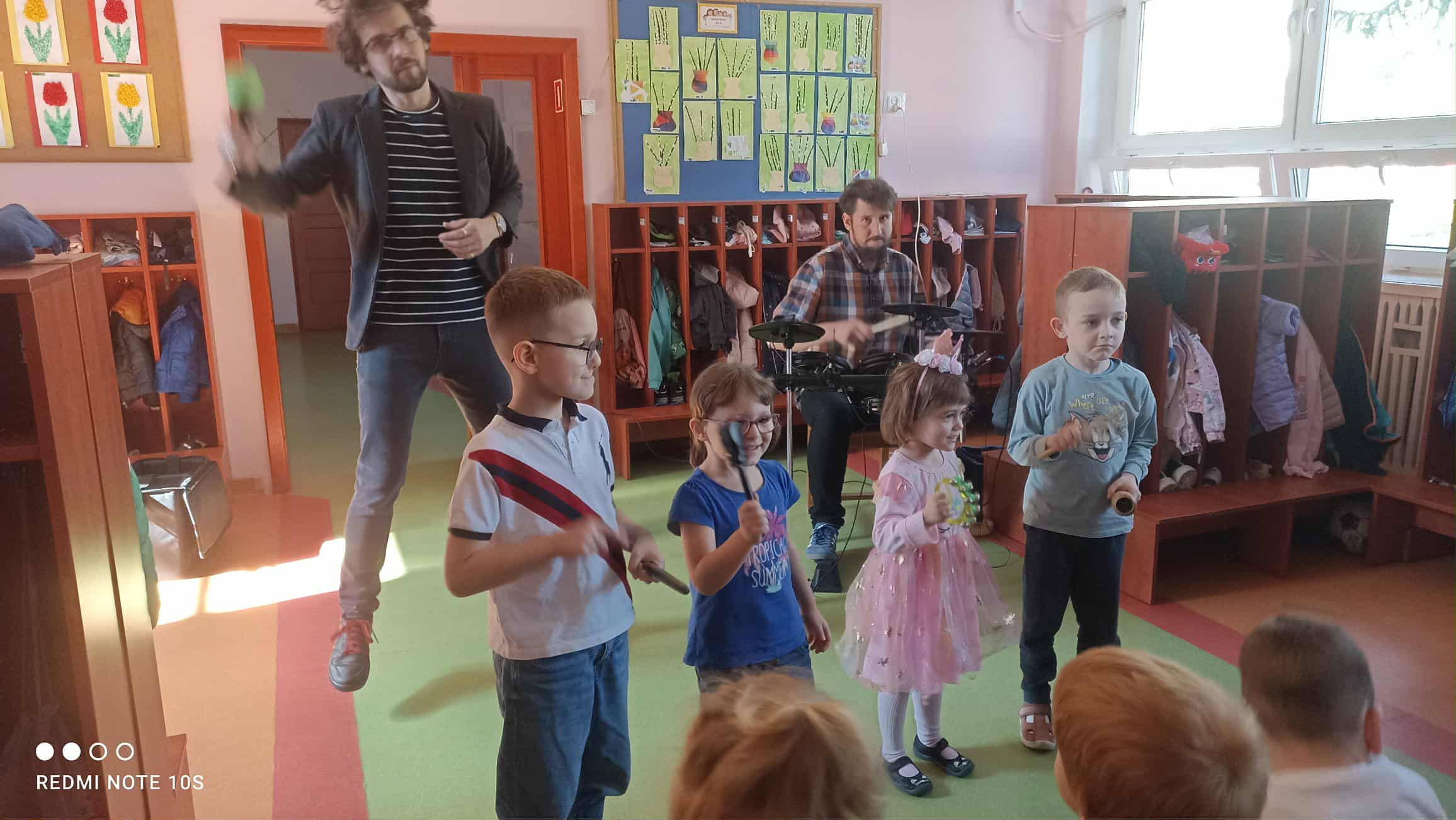 Marcowy koncert był pt. „Jest nas dwóch”. Tak jak w tytule w środę przyjechali do nas pan Jacek i pan Patryk. Na tym koncercie przedszkolaki poznały budowę i brzmienie perkusji elektronicznej. Dzieci dowiedziały się, że perkusja ma różne tony, zaś dźwięki wydobywane są podczas uderzania pałeczkami w talerze i bębny. Przy perkusji elektronicznej ważne jest też włączenie jej do prądu. Niektóre dzieciaki miały okazję na niej zagrać. Celem zajęć było rozwijanie wrażliwości muzycznej dzieci, poczucia rytmu oraz umiejętności wspólnego muzykowania.