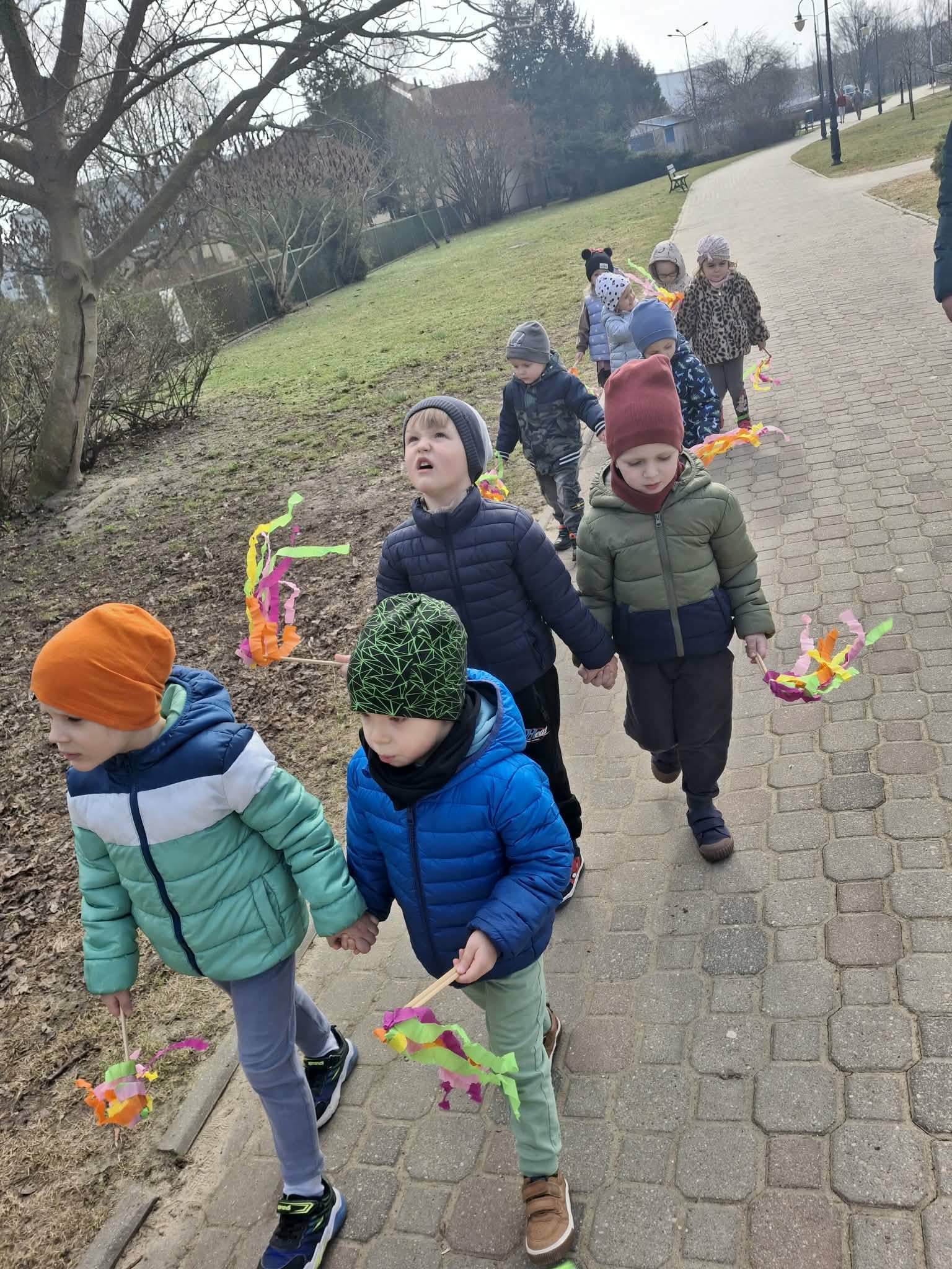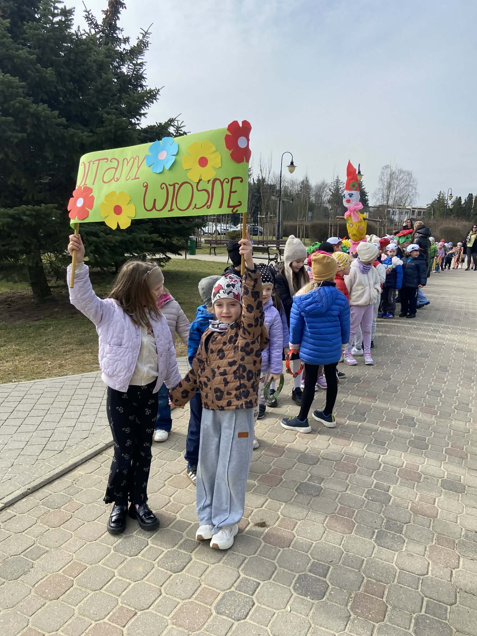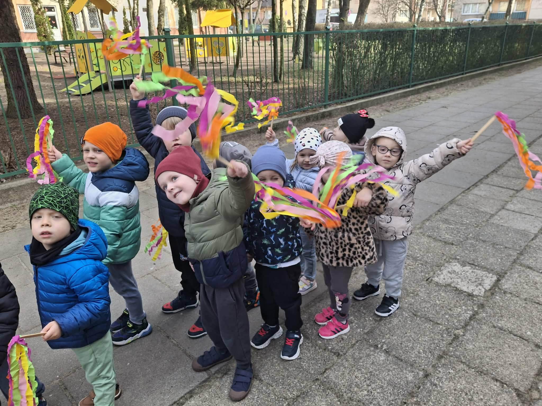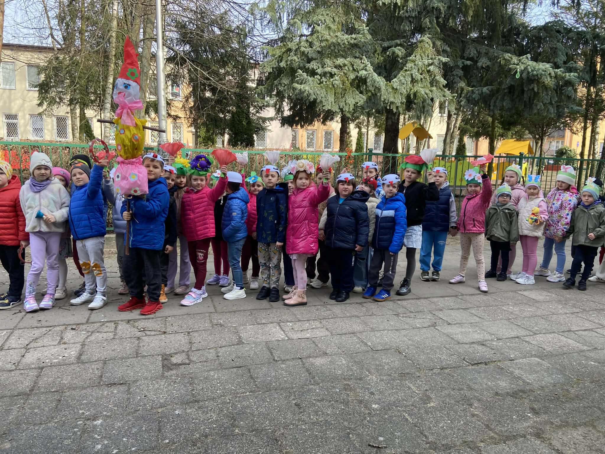 Przedszkolaki przygotowały kolorowe stroje oraz własnoręcznie wykonane ozdoby – kwiaty, gaiki i symbole odchodzącej zimy. Wspólnie, śpiewając wiosenne piosenki, przemaszerowaliśmy w okolicy przedszkola, żegnając zimę i witając cieplejsze dni. Obchody pierwszego dnia wiosny były nie tylko doskonałą okazją do wspólnej zabawy, ale także do nauki poprzez doświadczenie, rozwijania kreatywności oraz kultywowania tradycji. Dzieci z ogromnym zaangażowaniem uczestniczyły we wszystkich aktywnościach, co sprawiło, że ten dzień był pełen uśmiechu i pozytywnej energii.