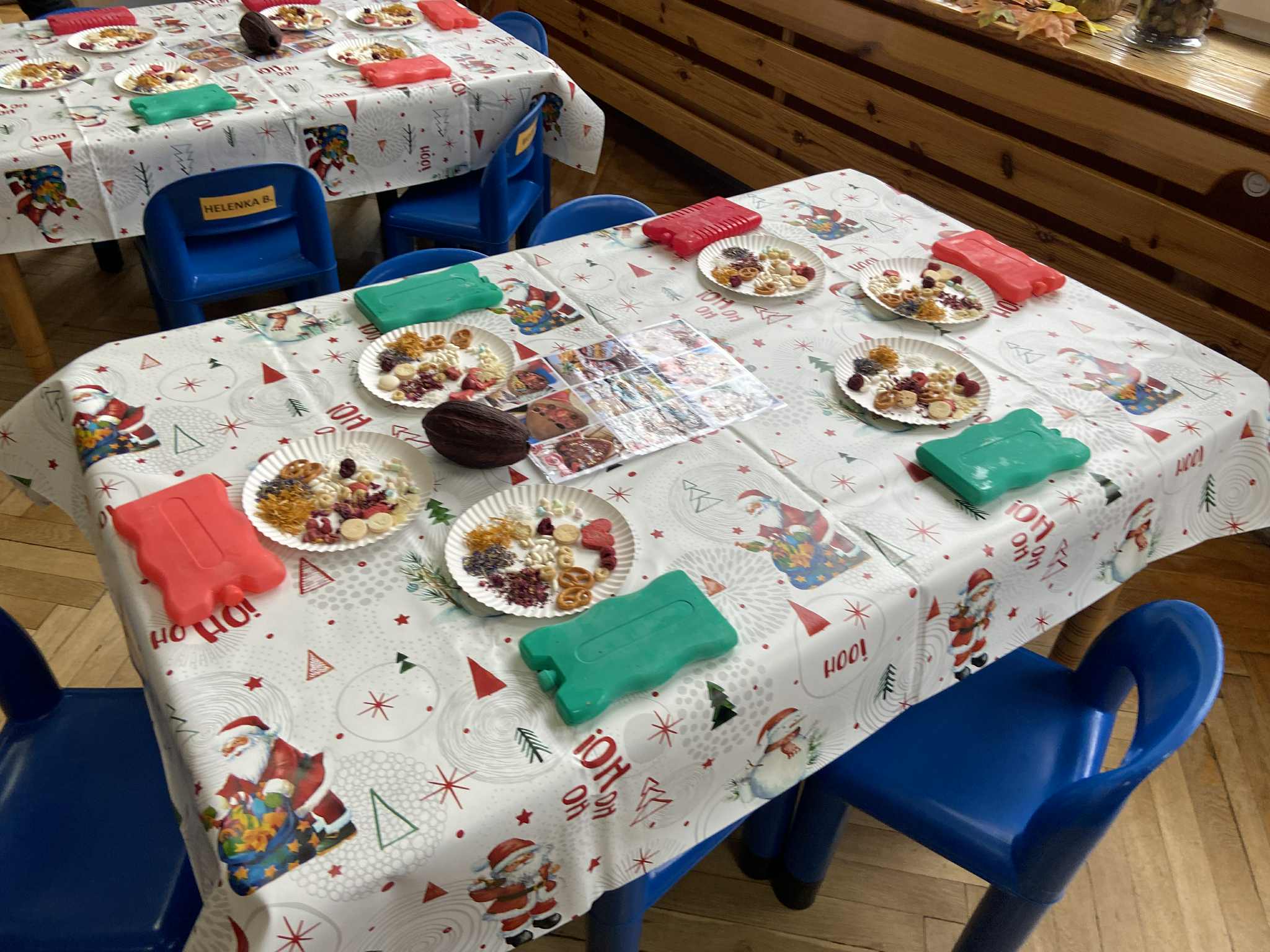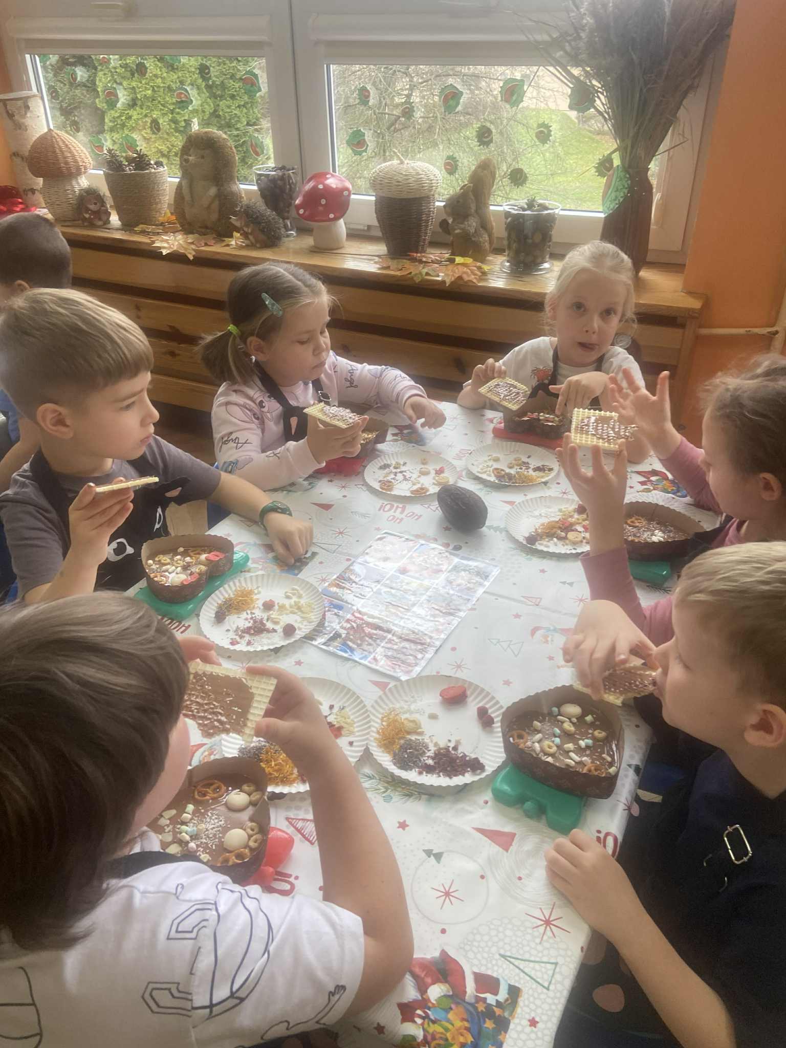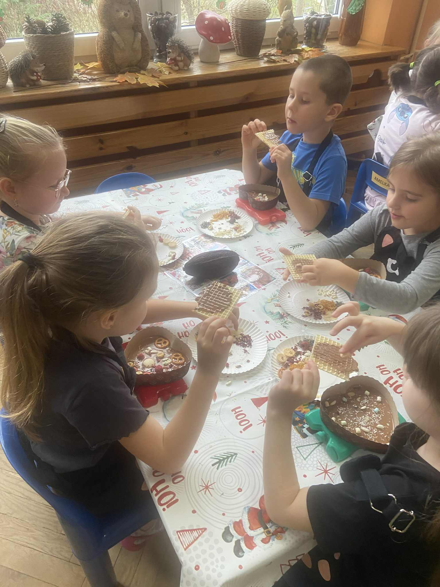21 listopada 2025 roku dzieci z grupy V (PSZCZÓŁKI), uczestniczyły w niezwykłych, słodkich i przyjemnych warsztatach, w których główną rolę pełniła czekolada. Warsztaty rozpoczęły się od opowieści jak i z czego powstaje czekolada.