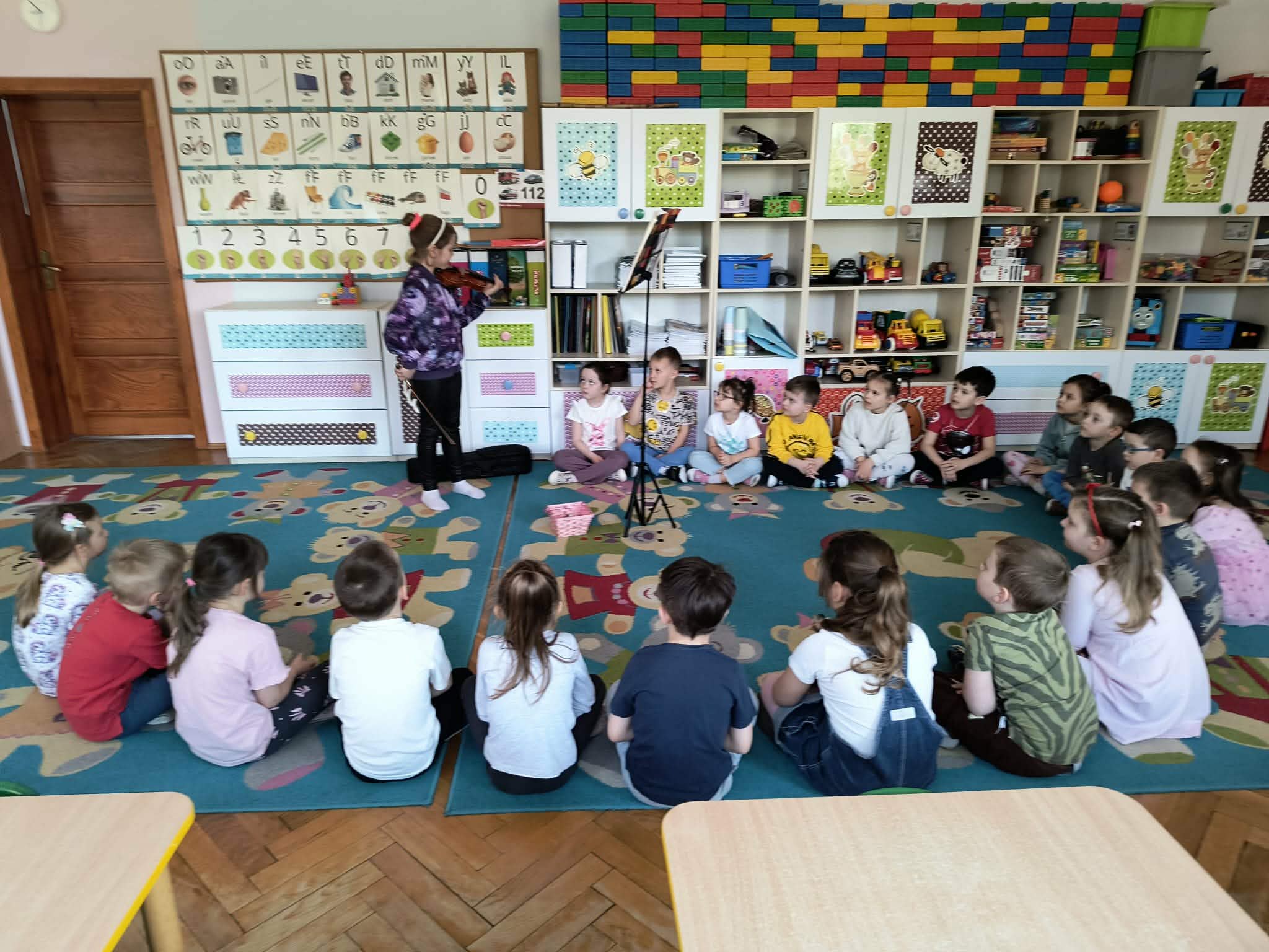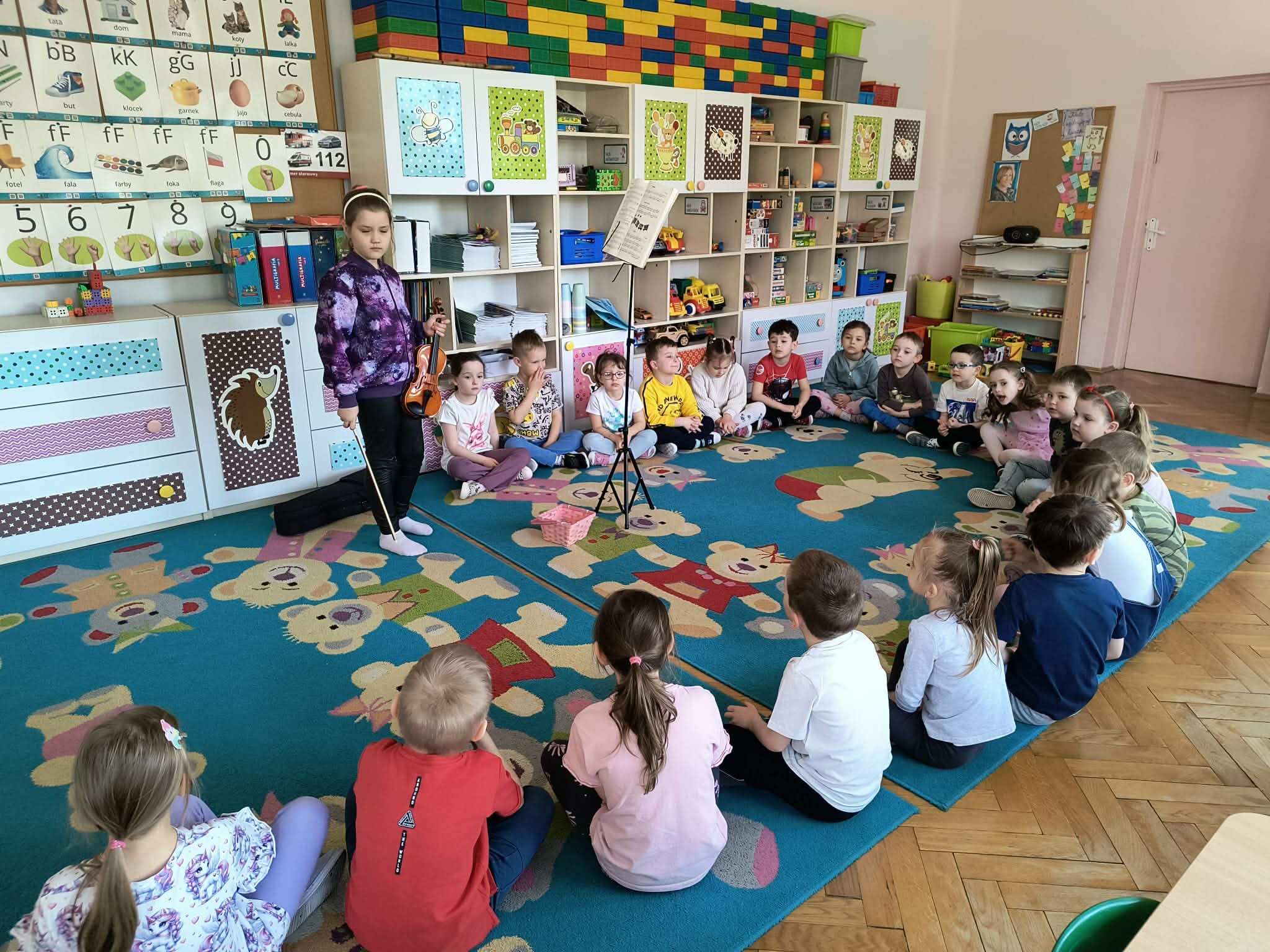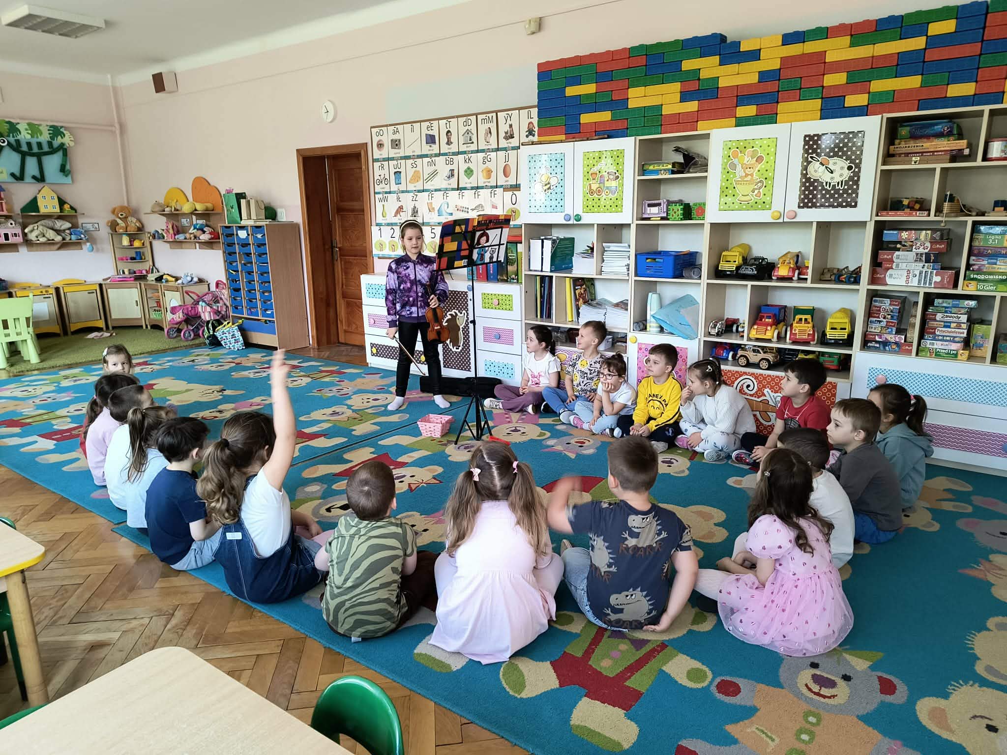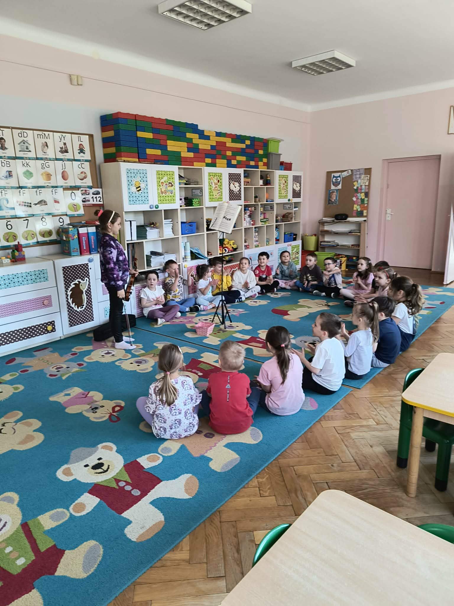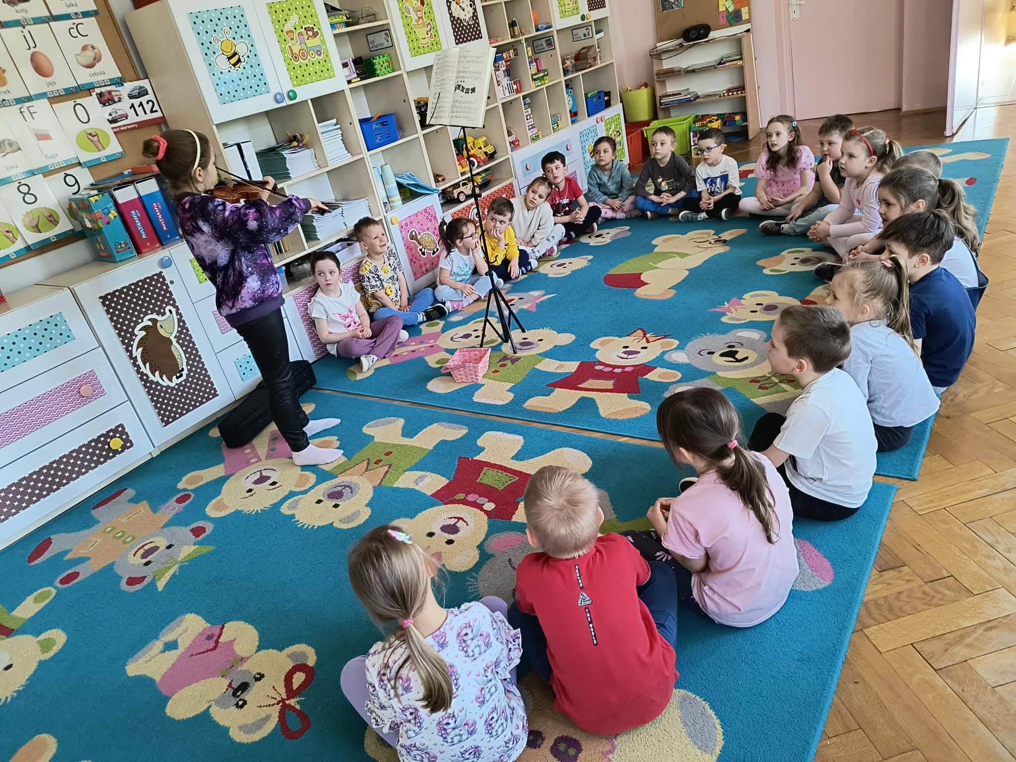 W miniony piątek grupę "Motylki" odwiedził wyjątkowy gość - siostra naszej Martynki - Agatka, która przybliżyła dzieciom świat muzyki klasycznej oraz tajemnice swojego instrumentu - skrzypiec. Spotkanie odbyło się w ciepłej i radosnej atmosferze, przedszkolaki z wielkim zainteresowaniem słuchały opowieści o skrzypcach - ich budowie, dźwiękach oraz roli w orkiestrze. Skrzypaczka zaprezentowała dzieciom różne melodie - od wesołych, tanecznych utworów, po spokojne, nastrojowe dźwięki. Dzieci z zachwytem rozpoznawały znane piosenki i rytmicznie klaskały do muzyki. Miały też okazję z bliska zobaczyć skrzypce, posłuchać ich brzmienia i dowiedzieć się, że dźwięki powstają dzięki drganiu strun poruszanych smyczkiem. Było to niezwykle radosne i inspirujące doświadczenie, które rozbudziło w przedszkolakach ciekawość i miłość do muzyki. Takie spotkania są nie tylko okazją do wspólnej zabawy, ale również doskonałą lekcją wrażliwości artystycznej i szacunku dla pracy muzyków. W galerii poniżej znajdują się zdjęcia dzieci biorących udział w spotkaniu.