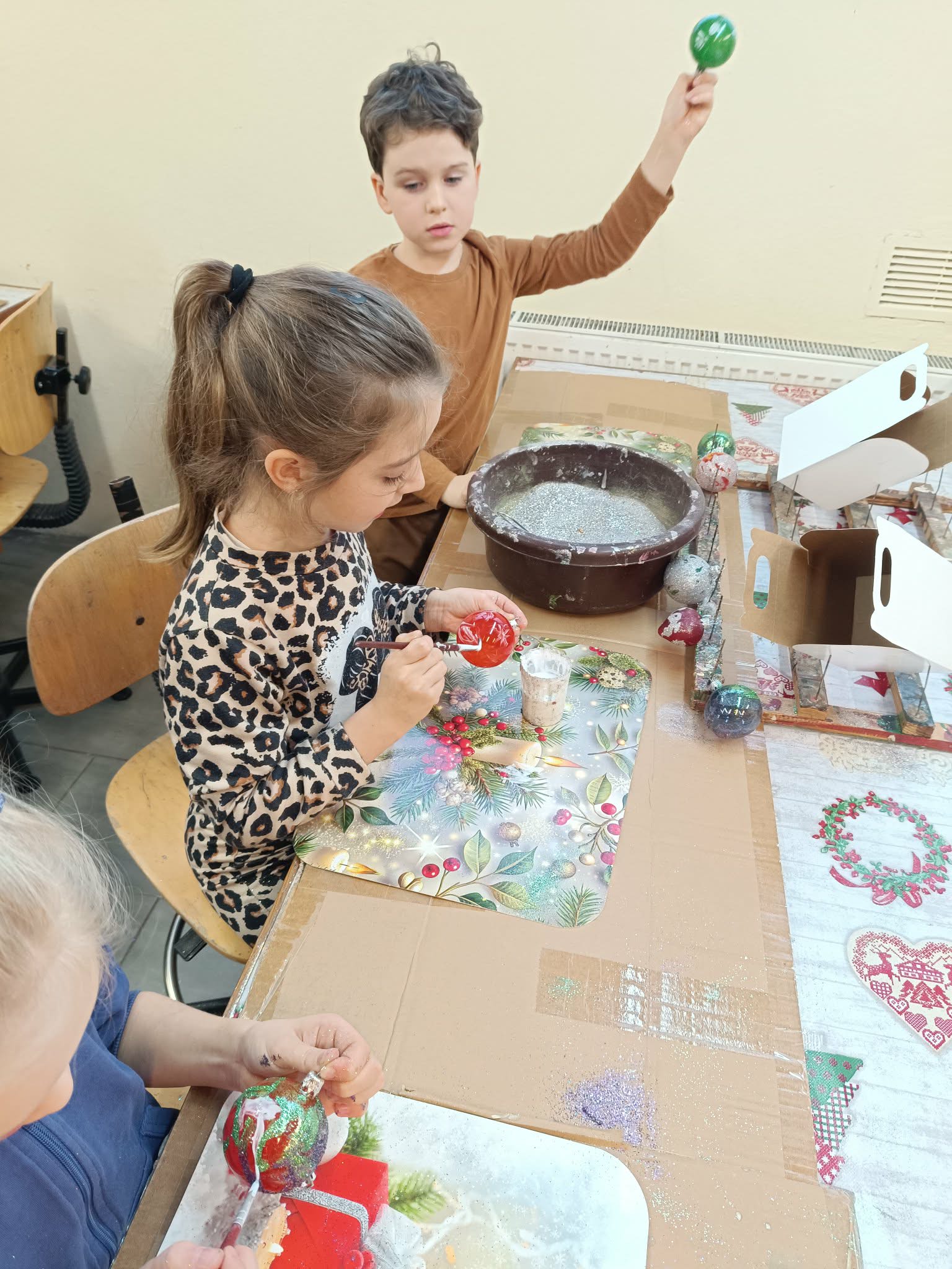 Największą atrakcją okazały się warsztaty kreatywne, podczas których każde dziecko samodzielnie ozdobiło własną bombkę. Powstały piękne, kolorowe i bardzo wyjątkowe ozdoby, które z pewnością udekorują świąteczne choinki w domach naszych przedszkolaków.