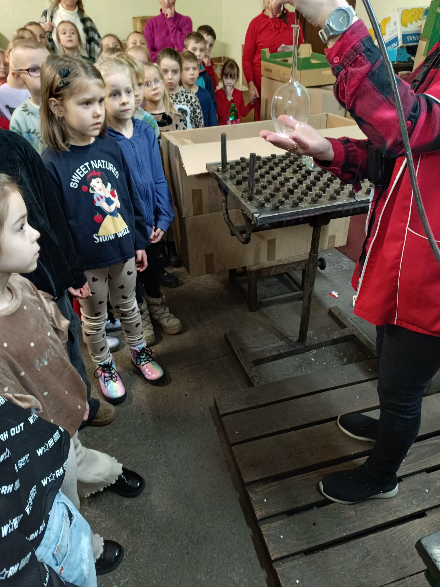 11 grudnia 2025 roku przedszkolaki z grupy IV wybrały się na niezwykłą wycieczkę do Fabryki Bombek. Dzieci mogły na własne oczy zobaczyć, jak powstają świąteczne ozdoby – od dmuchania szklanych kul, przez ich srebrzenie, aż po ręczne malowanie i dekorowanie.