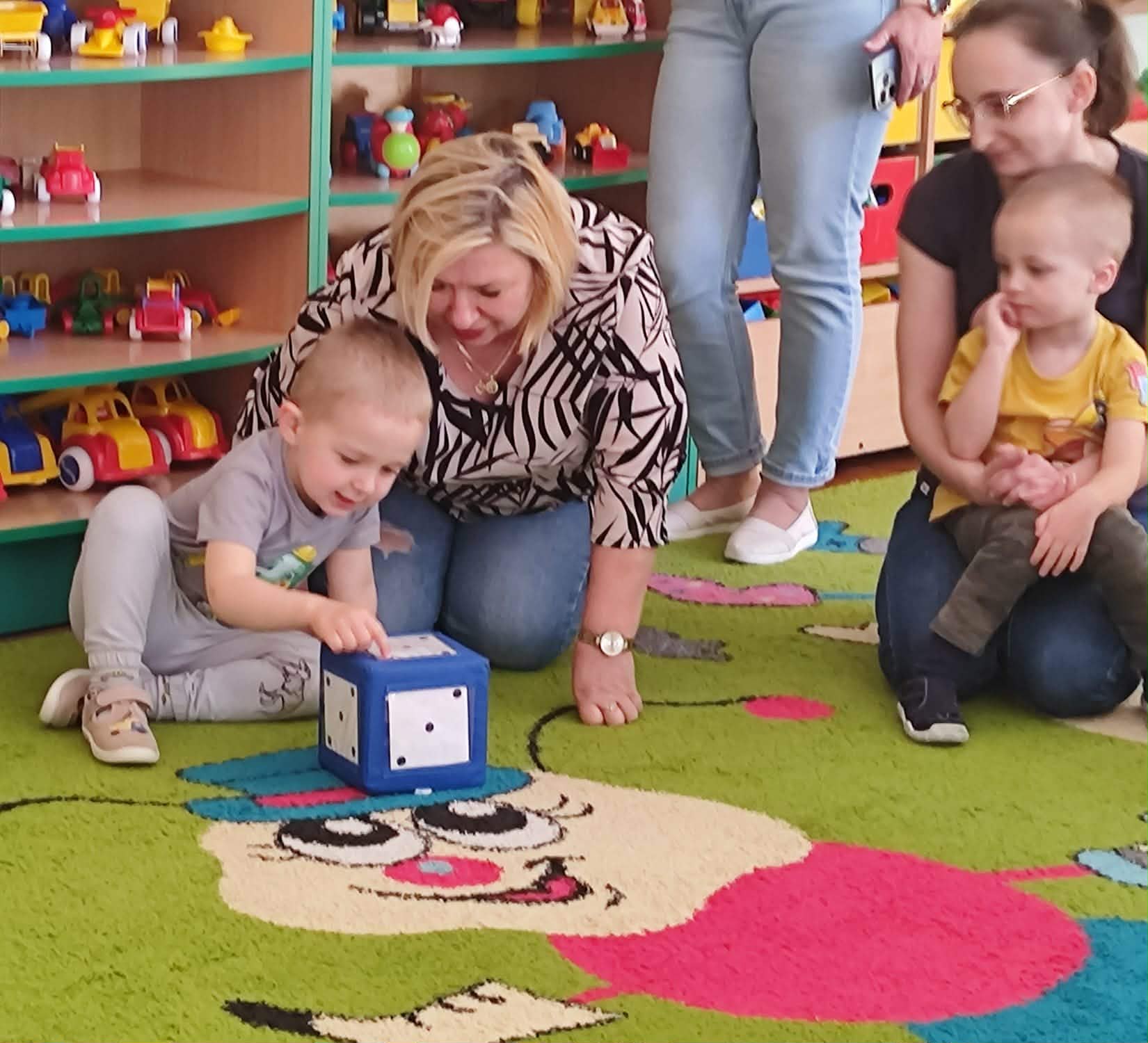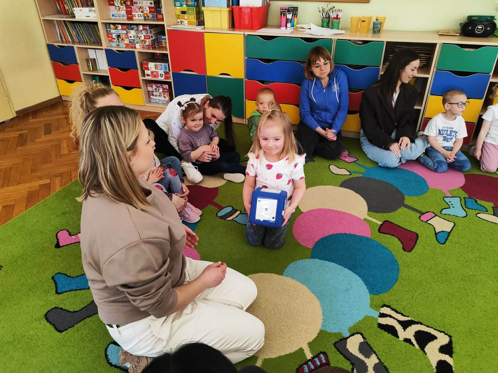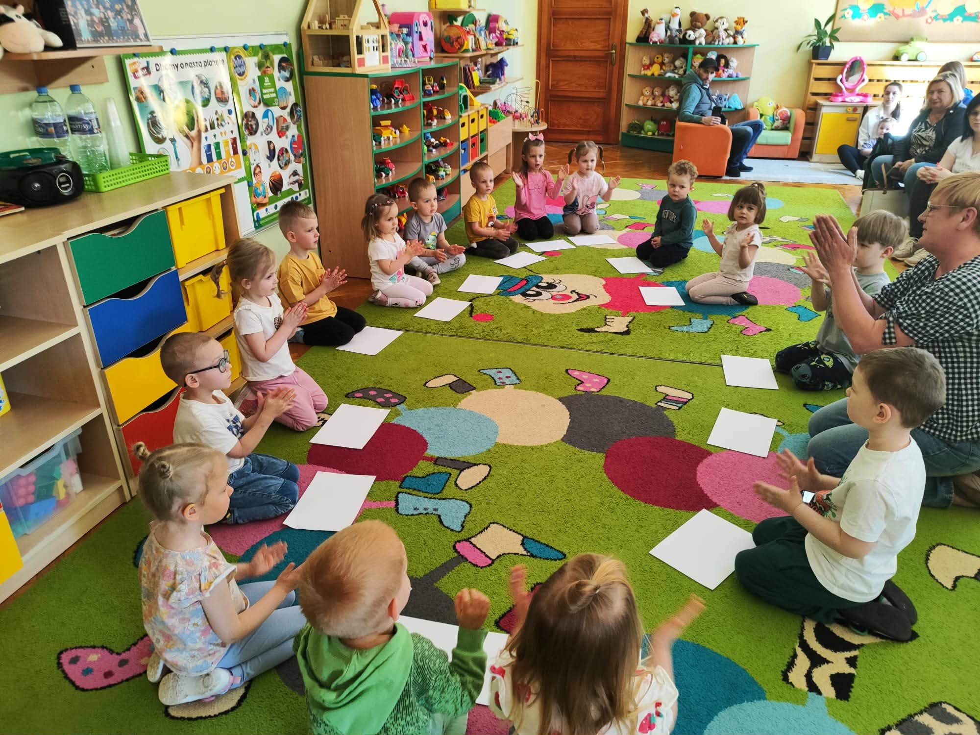 Zajęcia rozpoczęły się od wspólnych zabaw przy muzyce, które wprowadziły wszystkich w radosny i swobodny nastrój. Następnie uczestnicy brali udział w zabawach w kole, sprzyjających integracji oraz budowaniu relacji między dziećmi i rodzicami.